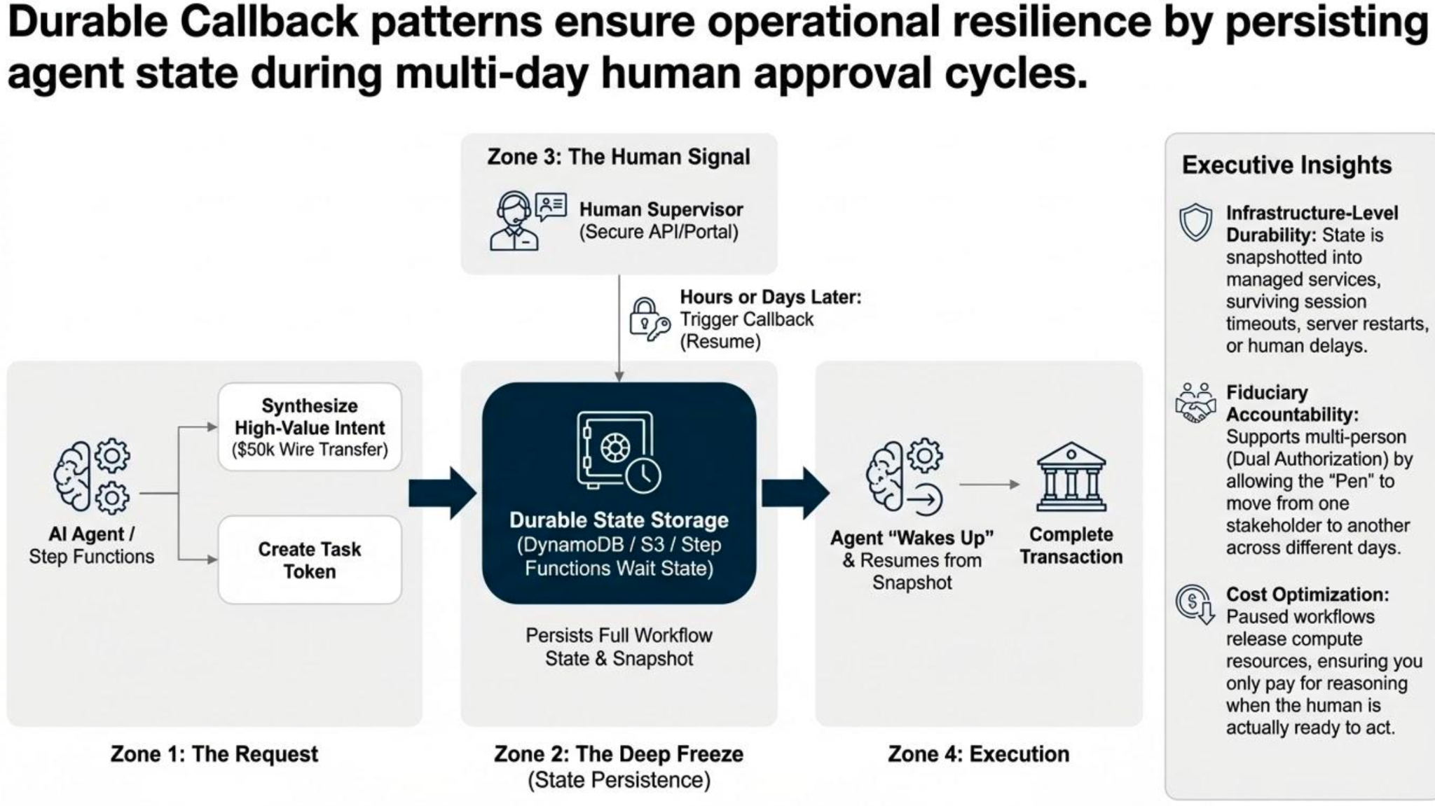 The workflow state is fully snapshotted into durable infrastructure. The agent enters a true paused/suspended state and waits for an external resume signal (e.g., API callback, task token, human-triggered event) — potentially spanning hours, days, or weeks.