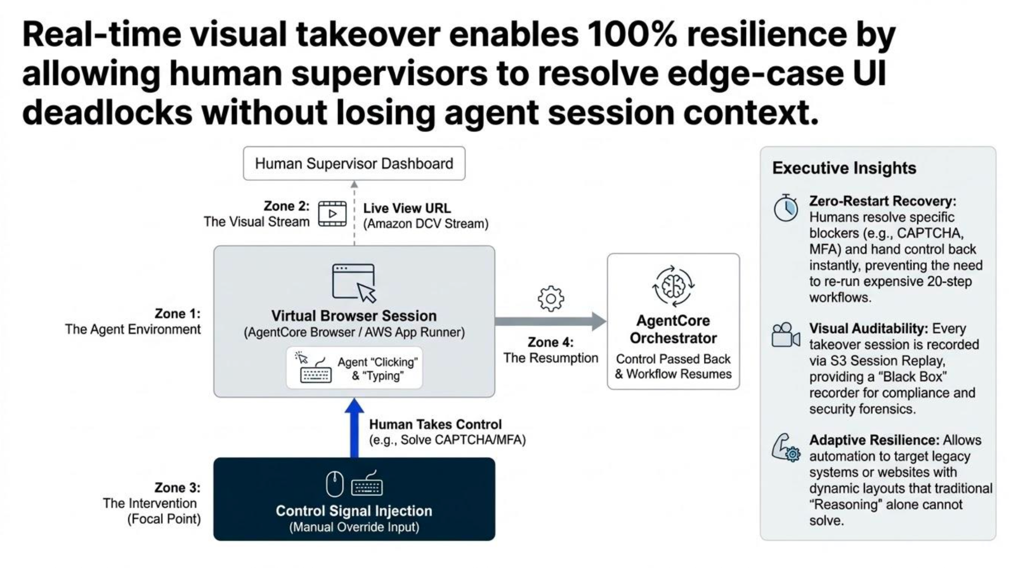 To break edge-case deadlocks that pure reasoning cannot overcome (CAPTCHAs, broken layouts, MFA flows, dynamic UIs). Without takeover, agents fail, loop infinitely, or require full human re-execution — wasting automation value.