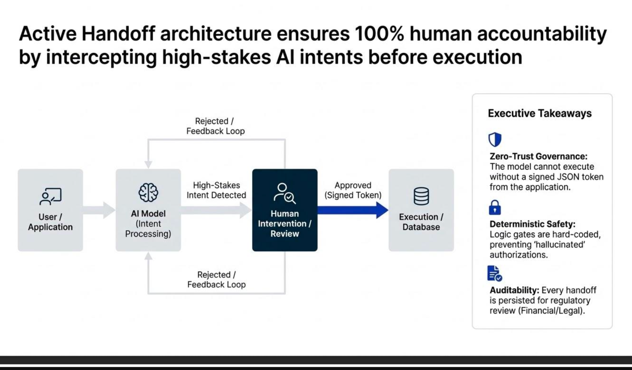 The Active Handoff ensures that while the AI does the labor of reasoning, the human maintains the authority of execution.
