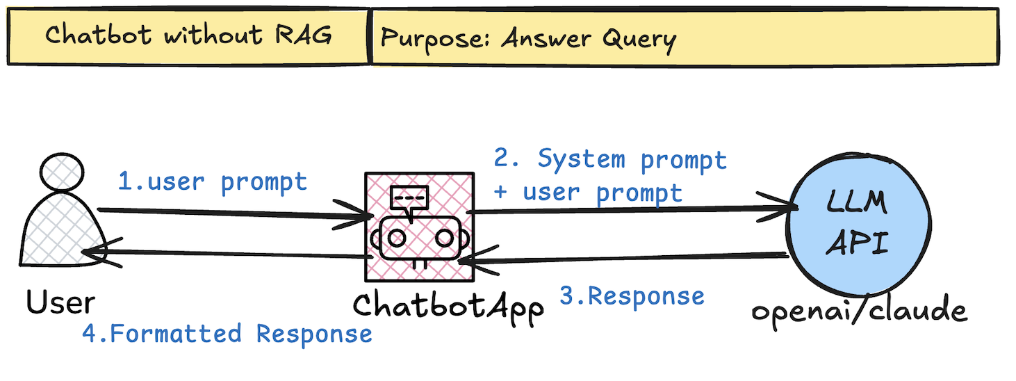 The journey starts with the simplest form of AI interaction — the basic chatbot without any retrieval capabilities.