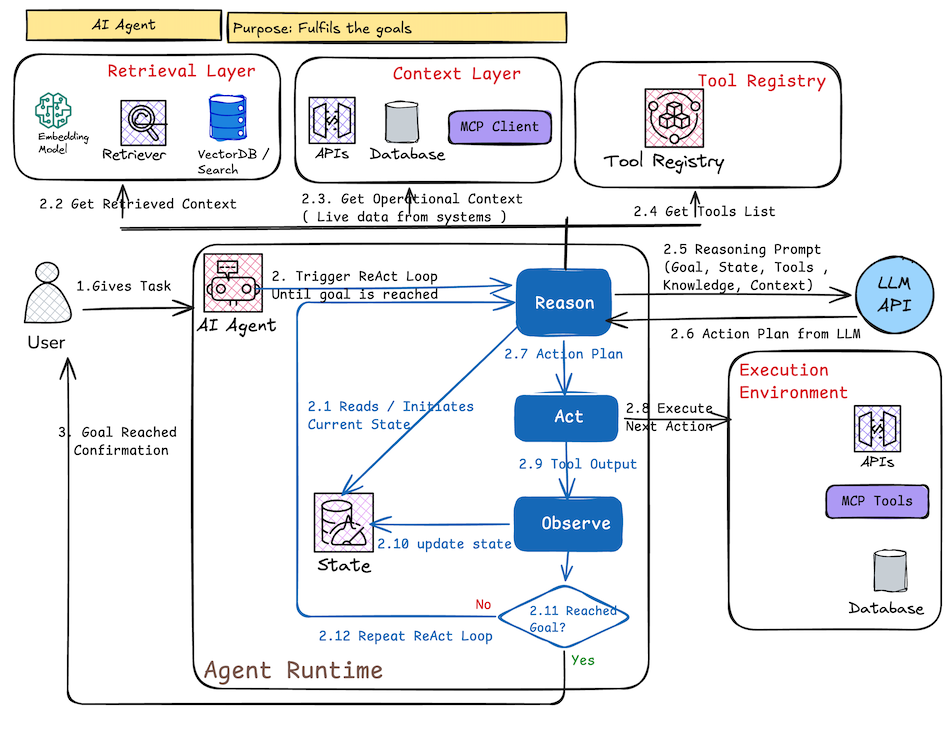 - Reason: LLM plans next step given current state, goal, retrieved context, tools list