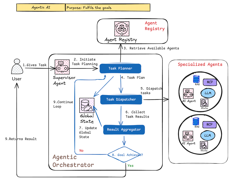 - Agentic Orchestrator → goal-directed multi-agent collaboration