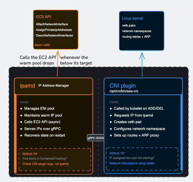 ipamd manages the pool. The CNI plugin consumes from it. Their boundary is the gRPC socket — and understanding where one’s responsibility ends and the other’s begins is the difference between a 10-minute debug session and a 3-hour one.