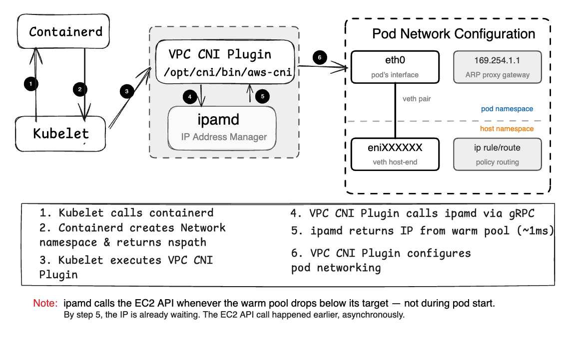 When a pod starts, kubelet invokes the CNI plugin binary directly. The CNI plugin calls ipamd over the socket, gets an IP in roughly a millisecond, then — entirely on its own — creates the veth pair, configures the pod’s network namespace, sets up routing rules, and returns success to kubelet. ipamd does not touch the Linux network stack. It does not create veth pairs. It does not set up routes. Once it hands off the IP, its job for that pod is done.