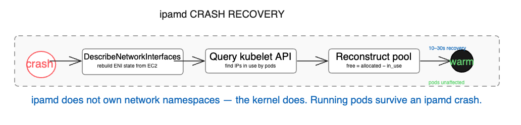 The startup sequence matters beyond normal operations. When ipamd crashes on a node with running pods, it recovers by calling DescribeNetworkInterfaces to rebuild ENI state from EC2 — this data lives in EC2, not in ipamd’s local memory. It queries kubelet to find which IPs are in use. It reconstructs the warm pool from the difference. Running pods are completely unaffected — their network namespaces live in the kernel, and ipamd doesn’t own them. The only consequence of a crash is that new pods cannot start until ipamd recovers, which typically takes 10 to 30 seconds.