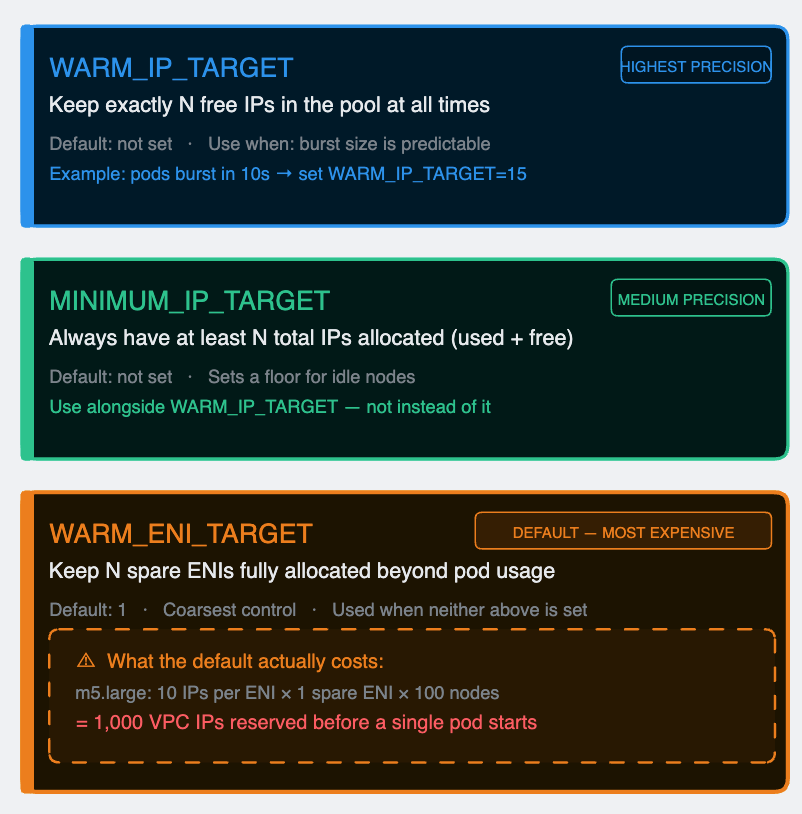 Three environment variables control the pool target. They are evaluated in priority order — WARM_IP_TARGET first, MINIMUM_IP_TARGET second, WARM_ENI_TARGET as the default fallback when neither of the others is set.