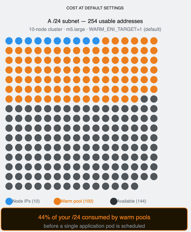 The default WARM_ENI_TARGET=1 is where most teams get hurt without realizing it. An m5.large holds 10 secondary IPs per ENI. With the default setting, every idle node permanently reserves 10 VPC IPs that no pod is using. In a 100-node cluster that’s 1,000 IPs consumed by warm pools before a single application pod is scheduled. In a /24 subnet with 254 usable addresses, warm pools alone consume nearly 40% of the space.