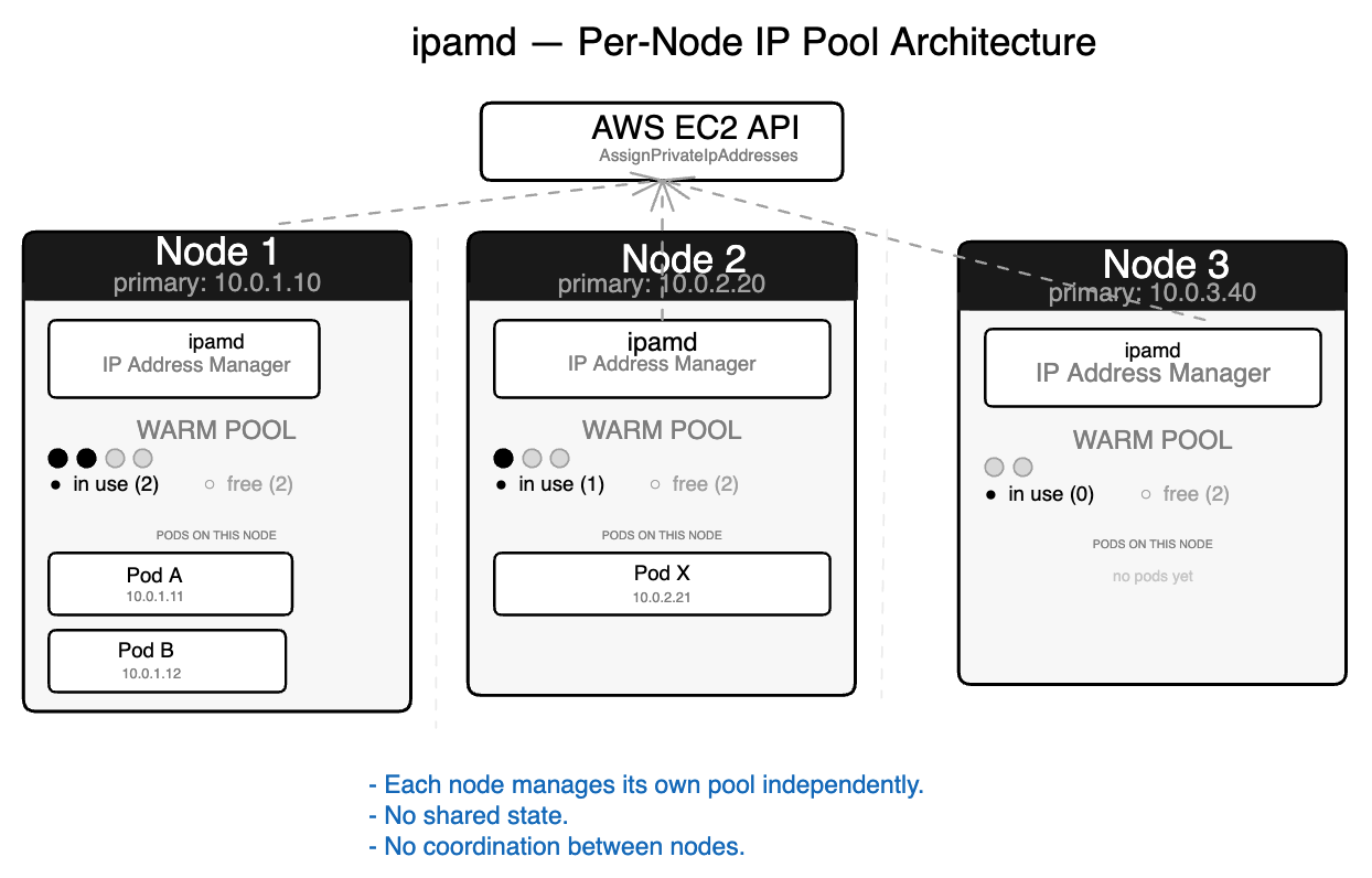 ipamd’s central mechanism is the warm pool — a buffer of pre-allocated IP addresses sitting ready before any pod requests them.