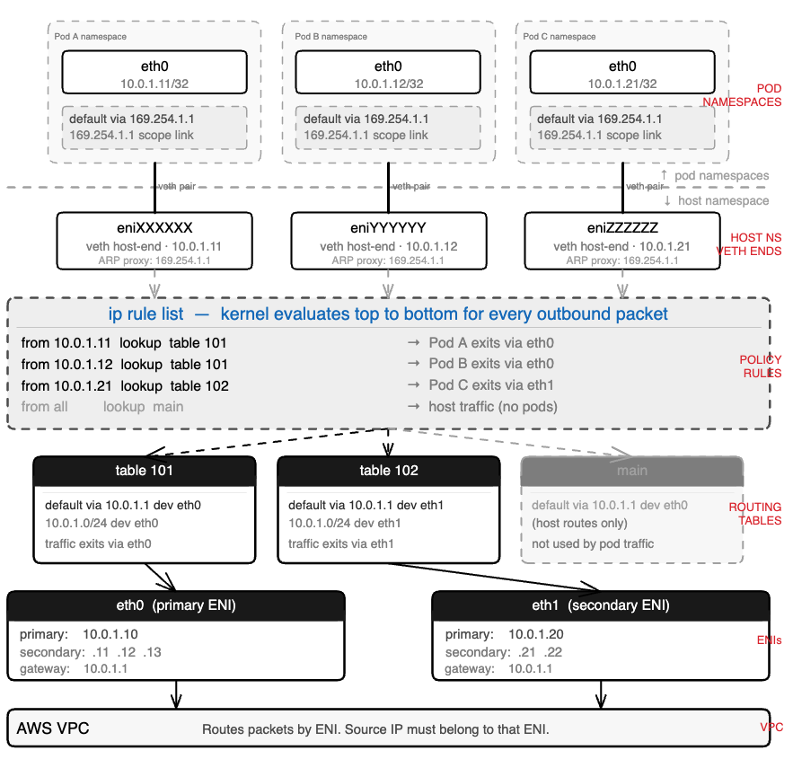 Each secondary ENI gets its own routing table in the host namespace. Each pod IP gets a policy routing rule that maps it to the correct table.