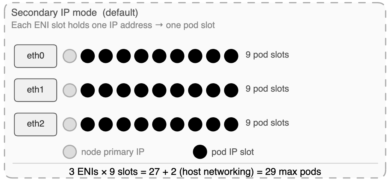 Every EC2 instance type has hard limits on how many ENIs it can attach and how many secondary private IPs each ENI can hold. These limits are not configurable. They are physical constraints baked into the instance type by AWS. And they directly determine the maximum number of pods a node can run.