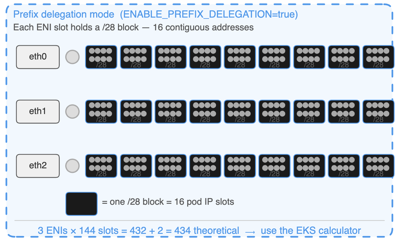 Prefix delegation changes the unit of IP assignment from individual addresses to /28 blocks — 16 contiguous IPs per block. One ENI slot that previously gave one pod IP now gives sixteen.