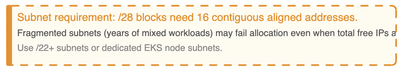 Prefix delegation requires 16 contiguous addresses aligned to a /28 boundary in the subnet. If your subnet is fragmented — individual IPs scattered across the address space from years of other workloads — EC2 may fail to assign a /28 even when total free addresses are sufficient. This failure is invisible in the console until allocation fails and pods don’t come up.
